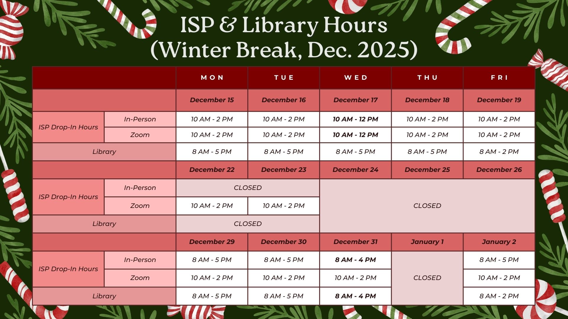 The ISP office will be open from 8 AM to 5 PM, Monday through Thursday, and 8 AM to 2 PM Friday, except during closure dates as listed below and in the side margin. Our office will close at 12 PM on Wednesday, December 17.
